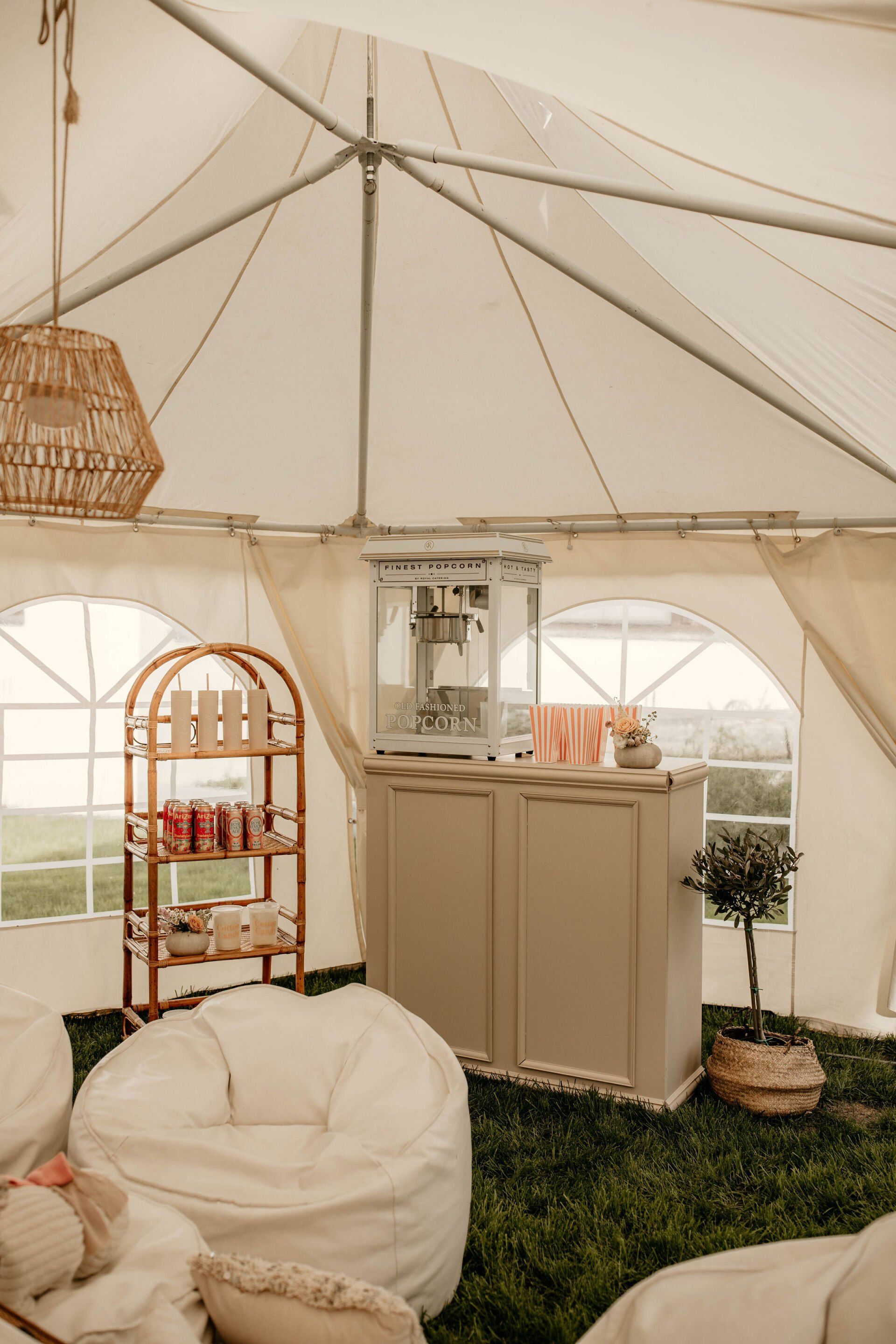 - Een dromerige setup die zo uit een romantische film komt. We voorzien loungezeteltjes, poefjes, bijzettafeltjes, tapijtjes, kussentjes, veel kaarsen en lichtjes, vaasjes met droogbloemen, dekentjes, boxen, scherm en zoveel meer.